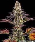 Dark vibrant shades of lime and olive-green large fan leaves evolve during its growth then in the right hands with the final stages of flowering a spectacular array of colours emerge. With a backdrop beautiful contrasting leaves displaying deep purples, with fading reds and orange tints. Densely compacted orbital shaped buds continually swelling in size, covered deep purple sugar leaves are gradually engulfed in the swollen lime green resin glands covered with bright amber pistils and golden coating of sticky resinous trichomes as she matures.